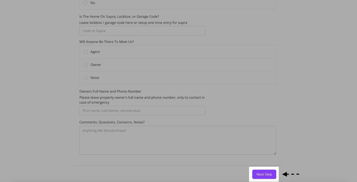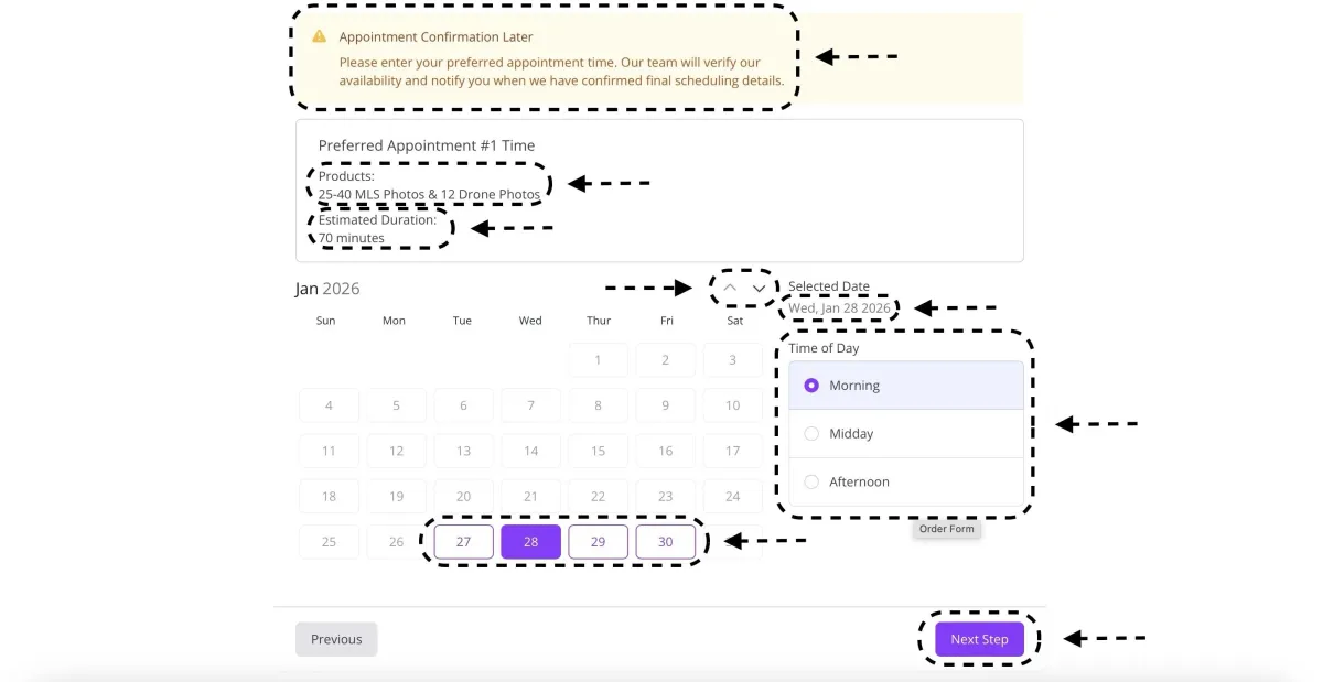 -Select the day and time you'd like to schedule for, use the arrows to move months, click on the purple boxes for the day, and the purple circles for time. Be sure to double check everything is correct and that the house is ready to go!