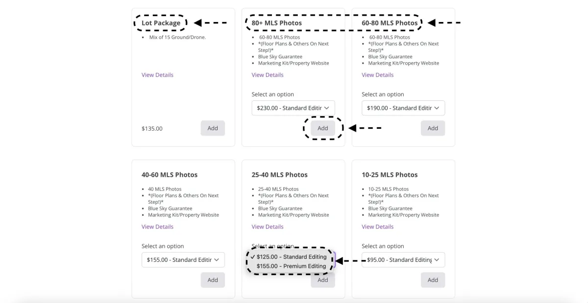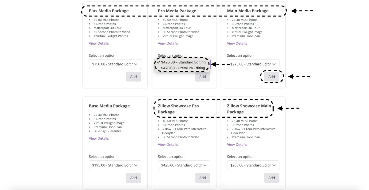 - Notice there are many packages some have Matterport, some have Zillow 3D Tours, some are for land etc